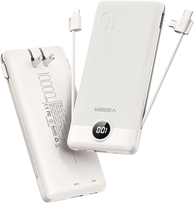 - All-In-One Portable Charger: No Extra Cables or Adapters Needed! Tired of carrying a tangle of separate chargers and cables? This power bank solves everything. Its integrated AC wall plug charges the bank itself directly from any outlet, while the three built-in cables (Lightning, USB-C, Micro USB) plus additional ports mean you can power up virtually any device. Leave the clutter behind and experience true freedom on the go.
