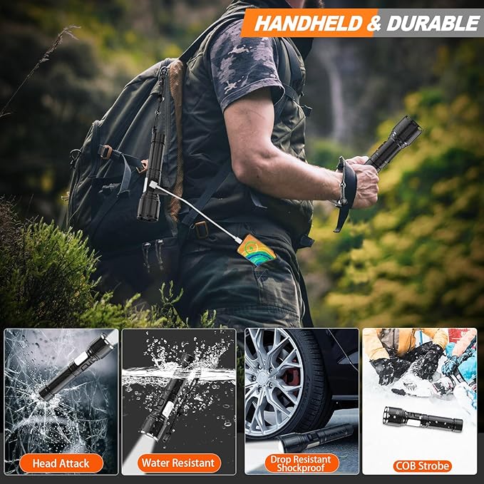 - Special Feature : Long Range, 100000 High Lumens & Long Beam LED High Lumens & Magnetic & 8 Lighting Modes & Adjustable Focus & One Key Turn Off, TYPE-C Rechargeable & Power Display & Waterproof & Tactical& Small, High Power, Durable, Impact Resistant Long Range, 100000 High Lumens & Long Beam LED High Lumens & Magnetic & 8 Lighting Modes & Adjustable Focus & One Key Turn Off, TYPE-C… See more