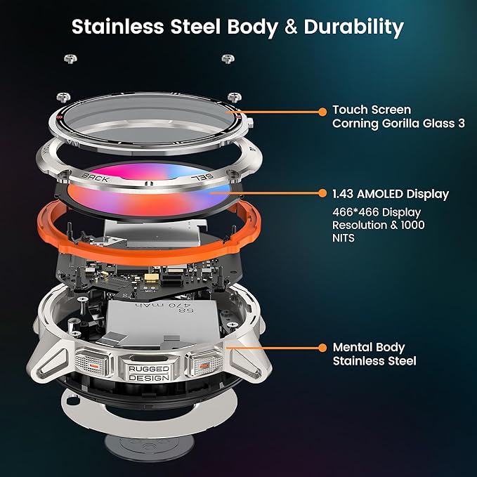 - ➤【Stainless Steel Unibody & Gorilla Glass】KOSPET T3 Ultra Men's Smartwatch with a unibody stainless steel metal case, boasts a 1.43" 3rd generation Corning Gorilla 9H double-layer glass display. The overall sports charm and casual business aesthetics make it highly resistant to scratches, drops, and polishing. It remains unfazed by any kind of wear and tear, falls, or collisions in daily life.