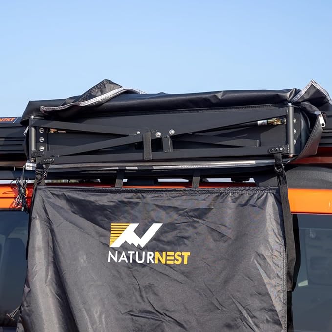 • Proven And Strong Structure: The aluminium arms are automatically opened by 2 gas struts at the rip of a magic sticker latch. L shaped backets for easy mounting and with retractable roof.