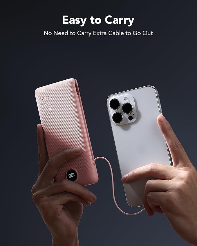 VRURC Portable Charger Power Bank with Wall Plug, 10000mAh Portable Charger with Built in Cables, PD 20W Fast Charging Portable Charger with Cords External Charger Travel Accessories-Pink(1 Pack)