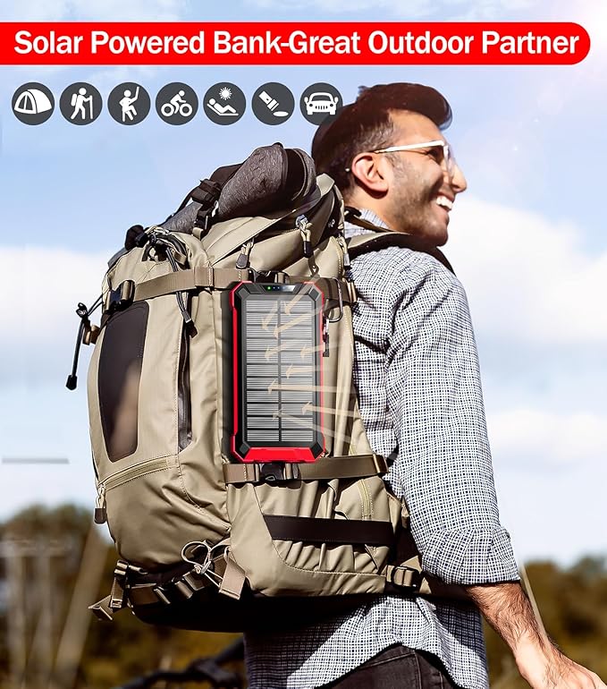 - [Sturdy&Durable Design for Outdoor] This solar battery pack is well made to be Waterproof/Shockproof/Dust-proof, which can withstand the harsh environment outdoors. It’s equipped with Dual super bright LED lights, a Must-Have tool for outdoor activities and home emergencies