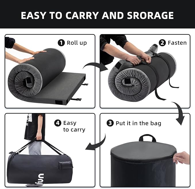 - HIGH-QUALITY TRAVEL BAG: The floor mattress can be rolled into a compact size to save more space in your home. Easy to carry and store anywhere with an included high quality, water-resistant travel bag, two zippers pocket on the sides keep valuables secure. Satisfied your needs whether outdoor.