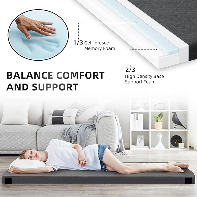 - COMFORT AND SUPPORTIVE FOAM: The camping mattress features a 2-Layer design that includes 1'' gel-infused memory foam and 2'' high-density support foam. The combination creates a medium-firm that balances comfort and support and keeps its shape even after long-term use.