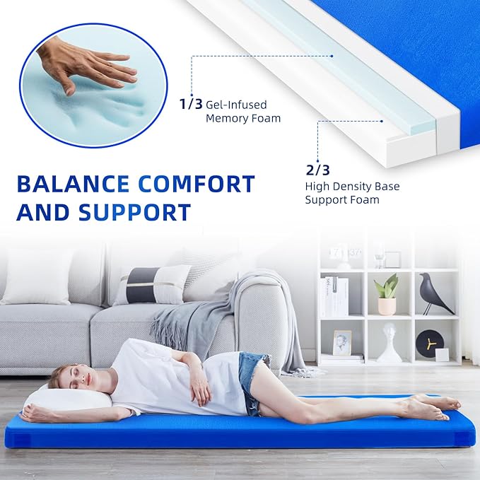 - COMFORT AND SUPPORTIVE FOAM: The camping mattress features a 2-Layer design that includes 1'' gel-infused memory foam and 2'' high-density support foam. The combination creates a medium-firm that balances comfort and support and keeps its shape even after long-term use.