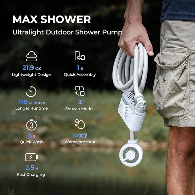 • ➤【Versatile Applications】: Featuring an 18.5 Wh battery and IPX7 water resistance, this compact shower pump with a collapsible hook is ideal for outdoor activities such as camping, car washing, pet cleaning, and more. Its versatility extends to traveling, hiking, road trips, and fishing, ensuring reliable performance wherever you go
