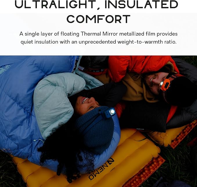 • One layer of floating Thermal Mirror metallized film provides quiet insulation with an unprecedented weight-to-warmth ratio.