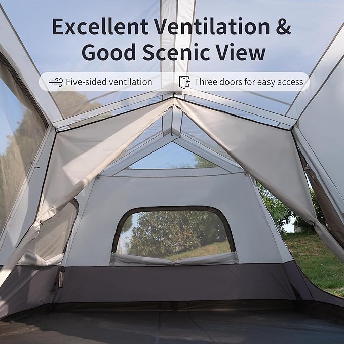 • Great Ventilation & Good View: It is a good ventilation tents for camping ,with five-sided ventilation: 3 big windows enjoy more air flow and great view, 3 large doors for easy access and ventilating, top mesh skylight also provide a great night view when open the rainfly.
