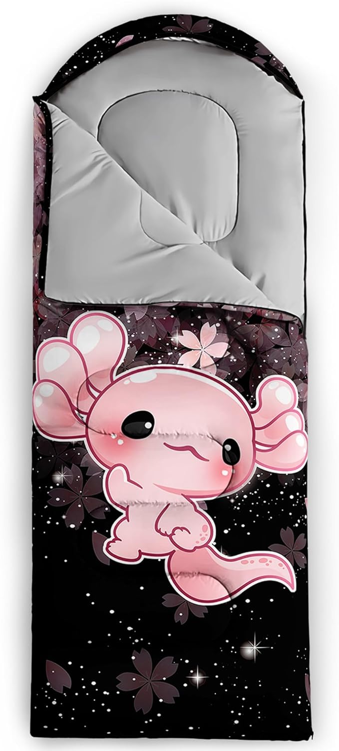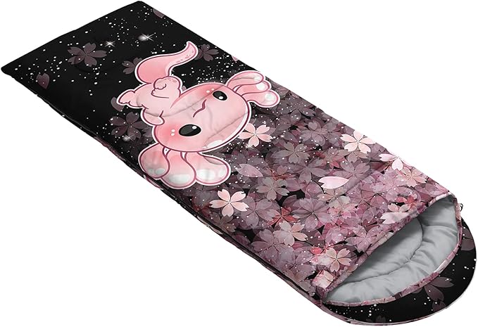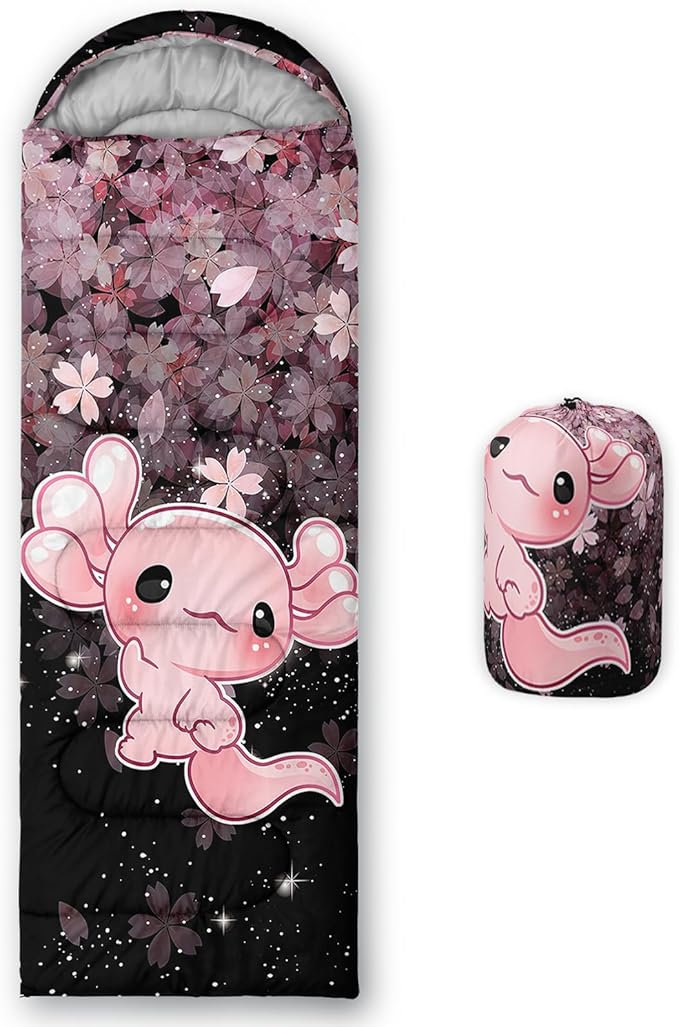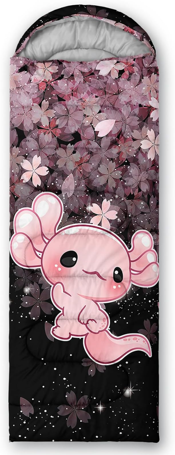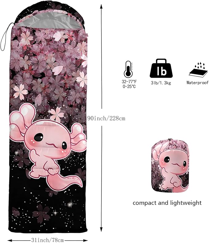 - 【Fits For 3 Seasons】: Size - 31 by 90 inches (W x D). Our Axolotl Cherry Blossom sleeping bag can be used in 3 seasons with a design temperature of 32℉-77℉(0℃-25℃). These Sleeping bags also have a weather resistant waterproof design to keep you warm and prevent you from any dampness.