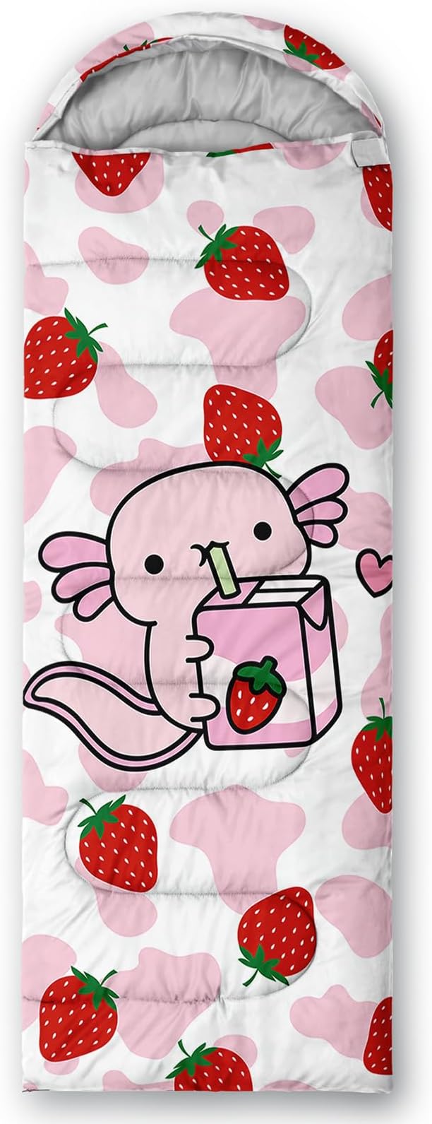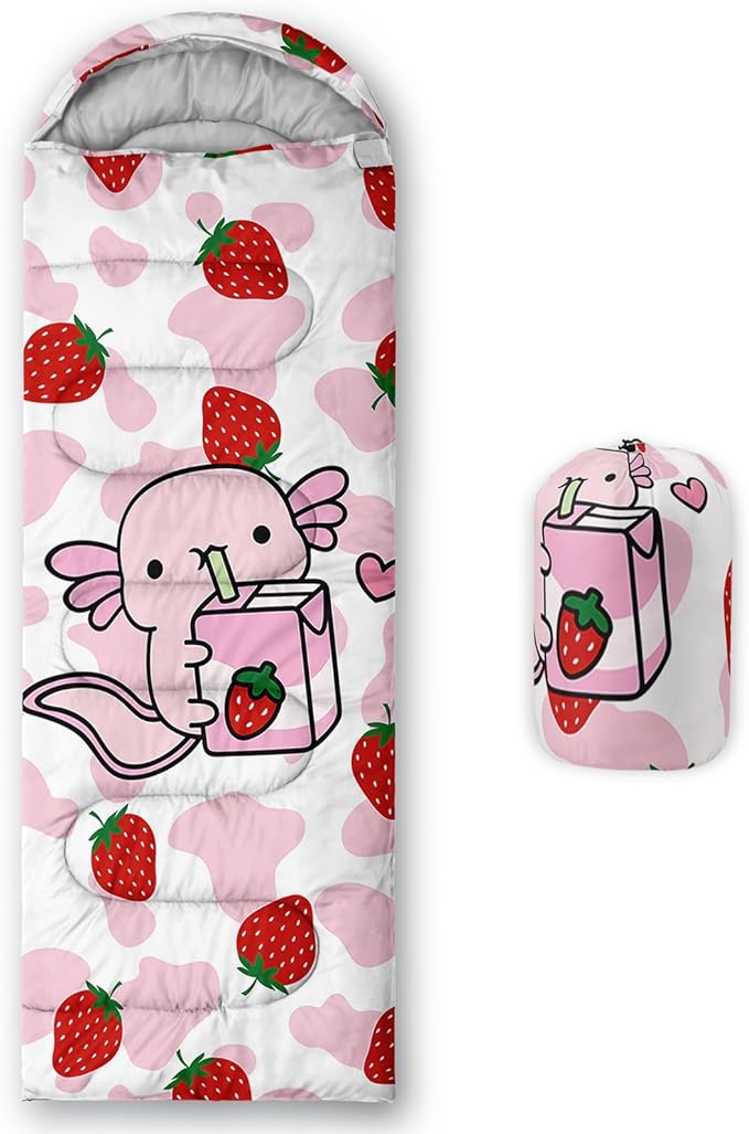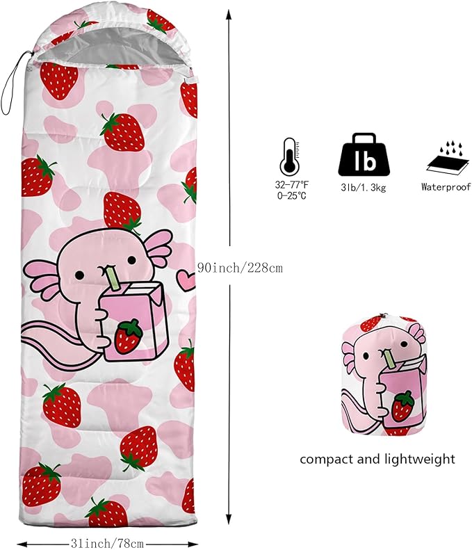 - 【Fits For 3 Seasons】: Size - 31 by 90 inches (W x D). Our Strawberry Axolotl sleeping bag can be used in 3 seasons with a design temperature of 32℉-77℉(0℃-25℃). These Sleeping bags also have a weather resistant waterproof design to keep you warm and prevent you from any dampness.