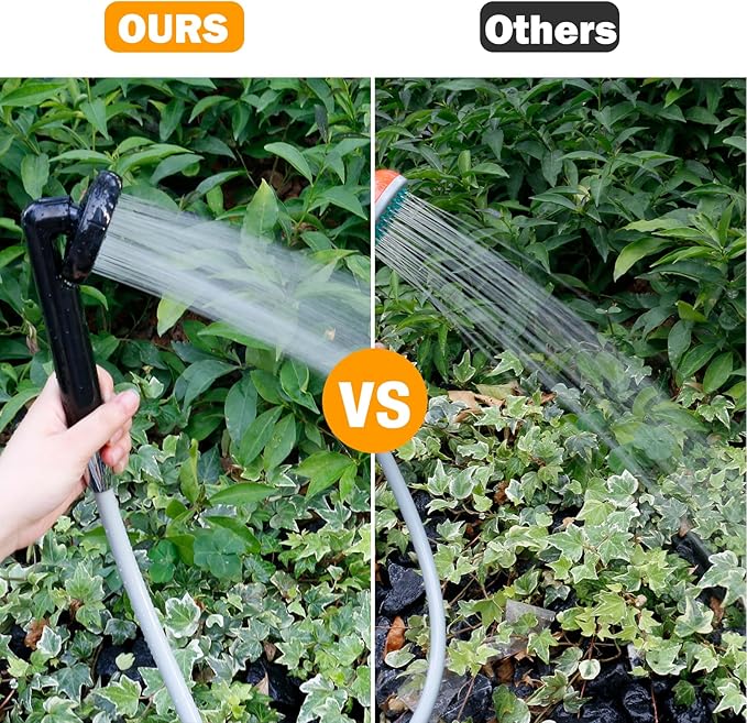 - 【Upgraded ON/OFF Shower Head】: With innovative design of built-in on-off valve, you can open or block water sprinkling and adjust the intensity of water flow by pressing down the shower head in different degree. This camping shower’s water outlet has stainless steel flat surface and fine holes, easier to clean and hard to accumulate dirt like traditional shower head. The portable shower head is more light and handy, even kids can grip it without effort