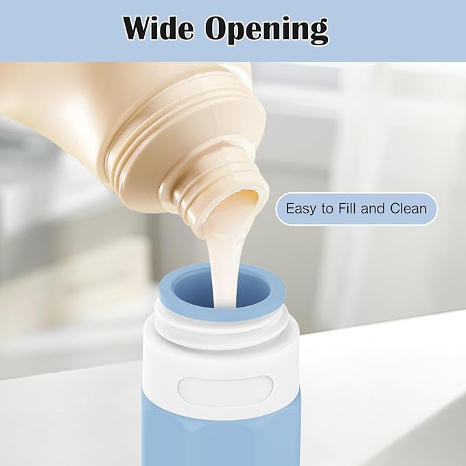 - Easy To Fill & Squeeze: Wide opening of the travel bottles for toiletries tsa approved and travel shampoo and conditioner containers for easy pouring in or out and washing silicone travel bottles for toiletries is a breeze. You can pour the liquid in more easily with the spoons and funnel. Travel toiletry bottles with labels and travel shampoo and conditioner bottles don't wrinkle or crease so you can squeeze the last bit of product you have in them without worrying about distorting its shape