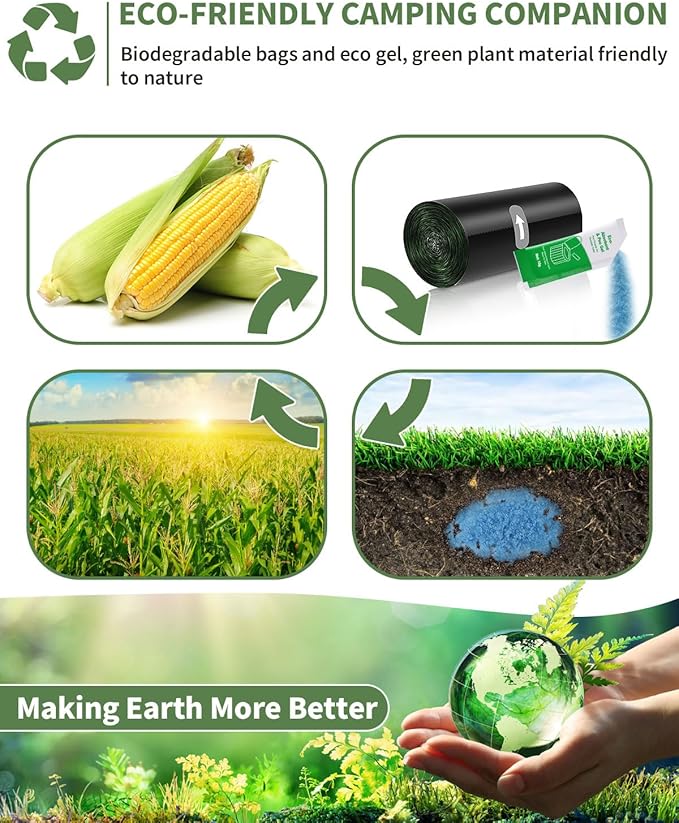 • π„π‚πŽ-π…π‘πˆπ„ππƒπ‹π˜ & ππˆπŽπƒπ„π†π‘π€πƒπ€ππ‹π„: Our portable toilet bags are made from corn starch, ensuring fully decompose within 45-180 days, safely turning into soil. Ideal for outdoor camp toilet, these 8 gallon biodegradable bags and eco camping toilet gel ensure zero environmental impact during camping waste disposal.