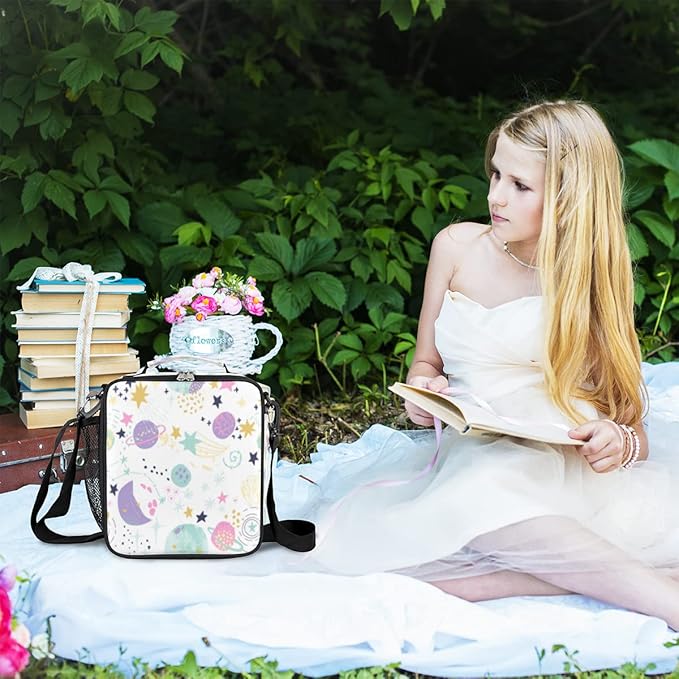 Space Lunch Box for Kids, Cartoon Space Planet Lunch Bag for Boys Girls, Reusable Insulated Waterproof Lunch Box with Adjustable Shoulder Strap Thermal Cooler Tote Bag for School Daycare Picnic
