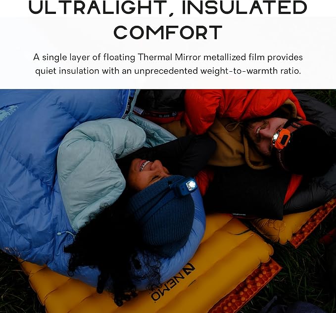 • One layer of floating Thermal Mirror metallized film provides quiet insulation with an unprecedented weight-to-warmth ratio.