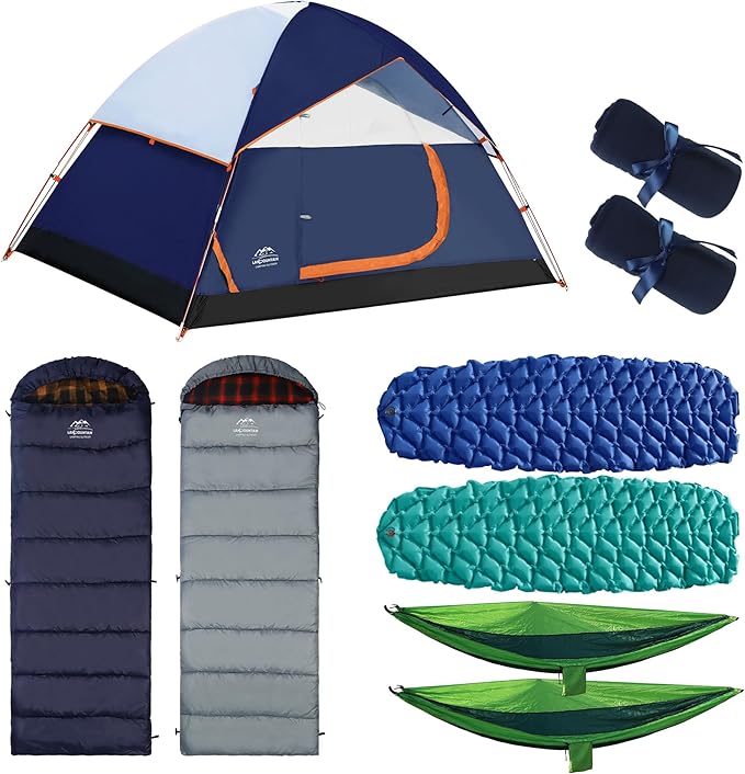 - ποΈ Complete Camping Set: The LANMOUNTAIN 9 Pcs Camping Set is a comprehensive package that includes everything you need for a memorable outdoor adventure. It consists of 1 camp tent, 2 sleeping bags, 2 hammocks, 2 sleeping pads/camping mats, 2 single camping hammocks with 2 tree straps, and 2 lightweight fuzzy bed blankets.