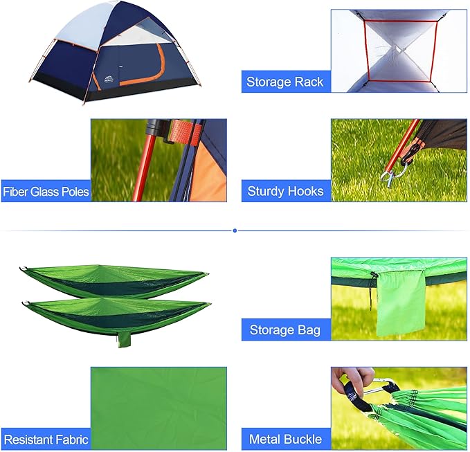 - π Premium Quality and Durability: Each component of this camping set is crafted with top-notch quality materials to ensure long-lasting performance. The tent is made of waterproof and tear-resistant fabric, while the sleeping bags and hammocks are designed for comfort and durability in outdoor conditions.
