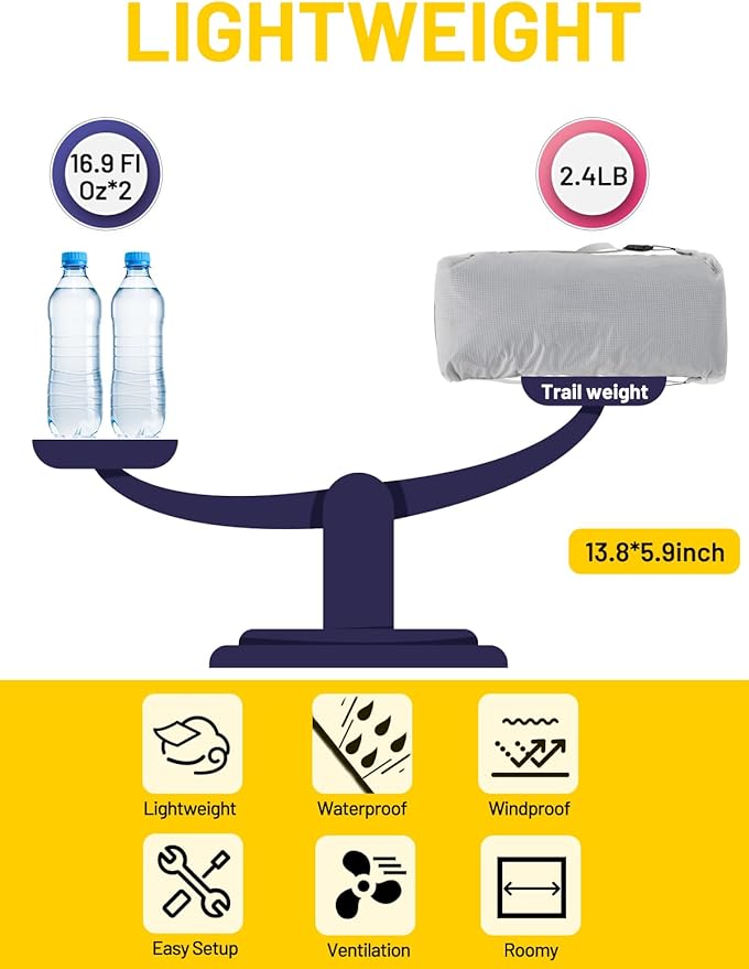 • ULTRALIGHT BUT DURABLE: Weighing in at only 2.8 pounds for 2 people tent. Easy packed small with 15.7in*4.7in, so you can carry it easily on backpacking or camping trips. Can be set up as a tarp-tent without bathtub and mesh walls, and also be set up as an inner mesh tent without rainfly