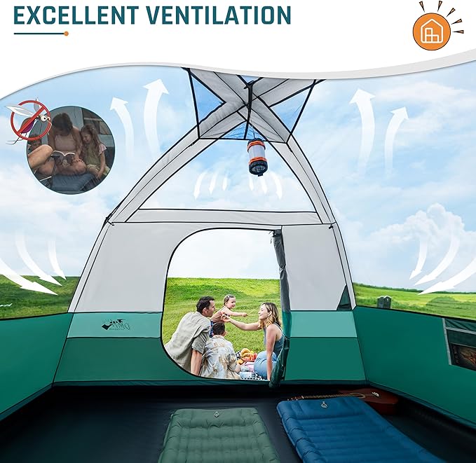 - Versatile Vestibule & Convenient Storage: The large vestibule of our tent serves as a multipurpose space, perfect for gear storage, relaxing, or even as a sheltered area to cook. Plus, with multiple mesh pockets and an overhead mesh loft, you can easily organize and store all your family camping essentials.