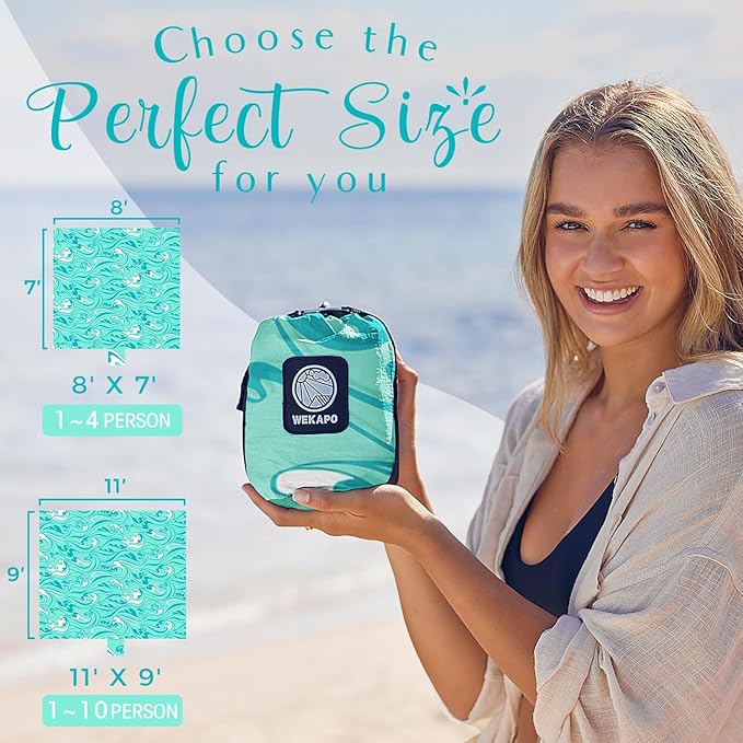WEKAPO Beach Blanket Waterproof Sandproof Oversized Extra Large Sand Free Beach Mat with Stakes, Storage Bag - Essentials for Outdoor Beach, Picnic (Turquoise Ocean Waves, 11 X 9 FT (1~10 Person))