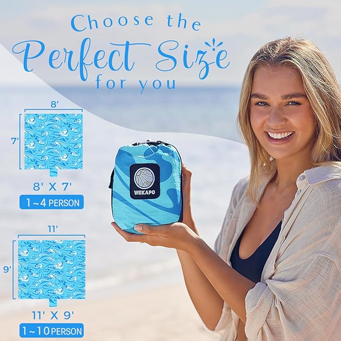 WEKAPO Beach Blanket Waterproof Sandproof Oversized Extra Large Sand Free Beach Mat with Stakes, Storage Bag - Essentials for Outdoor Beach, Picnic (Blue Ocean Waves, 11 X 9 FT (1~10 Person))