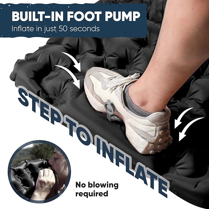 - SELF INFLATING CAMPING MATTRESS: It comes with a foot pump and inflates in just 50 sec with no blowing required, which is convenient and easy, no longer need to inflate with your mouth, extra inflating bag or carry a pump, and it only takes 1 second to quickly deflate and quick to pack back. It has a non-leak air valve, you shall never worry about air leaking!
