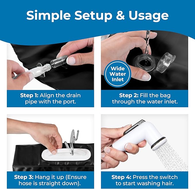 • Easy to Use: Simply fill the bag with warm water from any regular kitchen or bathroom faucet. The flexible water hose provides ample slack for easy maneuverability during the hair washing process, ensuring a hassle-free experience for caregivers.