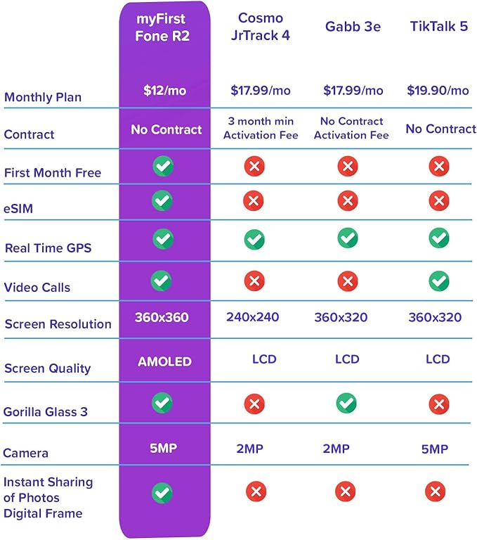 - [All-In-One Smart Watch for Kids with Unlimited Talk, Text, & Data] Secure two-way calls, messaging, and video calls with parent-approved contacts, powered by advanced eSIM technology with an independent $12/month pre-paid plan (first month free). This kids watch has its own plan and cannot connect to a family plan, ensuring added peace of mind through the myFirst Circle app.