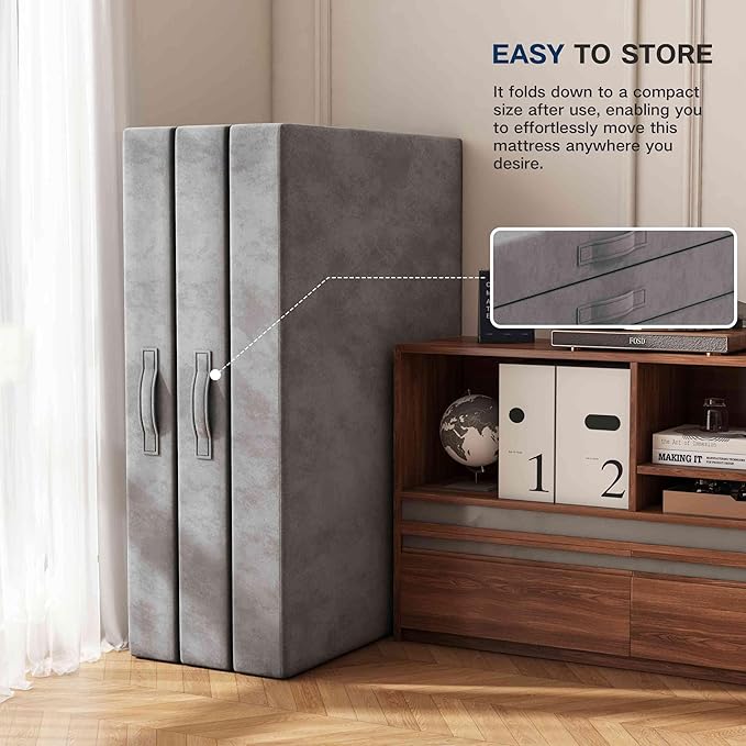 - Multi-functional & Space-Saving - The Swbvs Tri-Fold Mattress is designed for versatility, folding into a sofa, lounger, or ottoman, and serving as a guest bed. Simply unfold the memory foam mattress topper for a comfortable night's sleep on any floor surface. This portable mattress is easy to store and carry, featuring built-in handles for convenient mobility during travel, gatherings, RV trips, or camping.