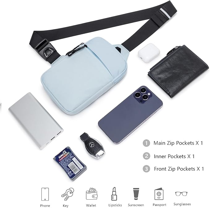 - Practical Capacity: This lightweight sling chest bag has 1 main zip pocket and 1 front zip pocket. The main zip pocket contains 1 mesh inner pocket. Stay organized with multiple compartments. Enough capacity to hold power bank, ID cards, mobile phone, keys, cash, passport, earphones, etc