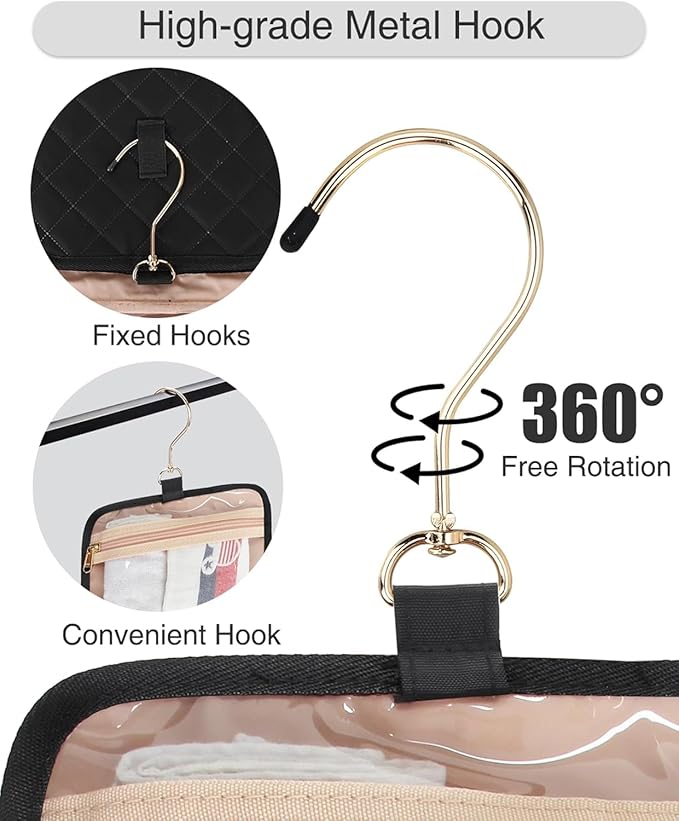 - Convenient and Durable Hanging Metal Hook: The hanging toiletry bag makes travel more convenient and portable,the durable metal hook let you to hang your bag by your side for quick access to items. A carrying strap is included to ensure easy carrying of your bag when traveling.