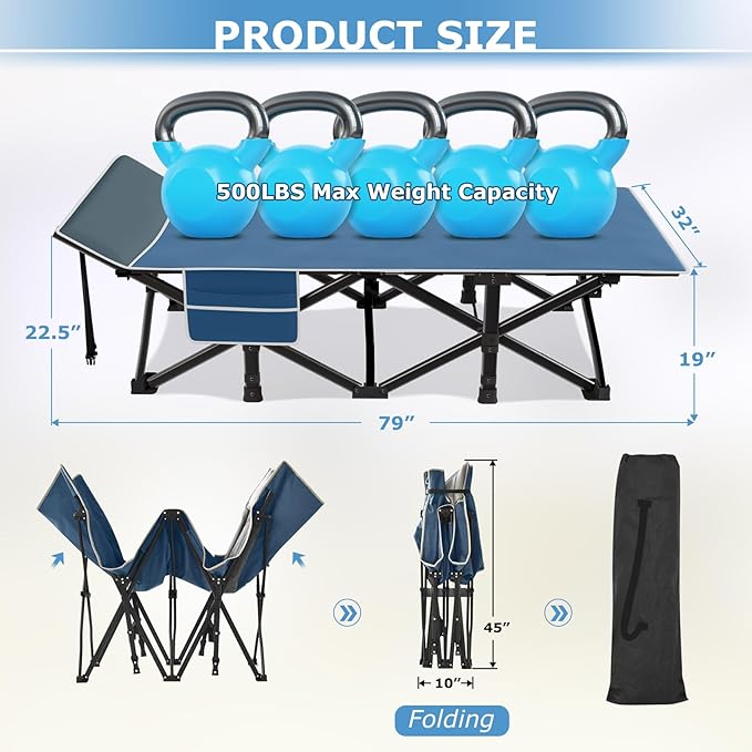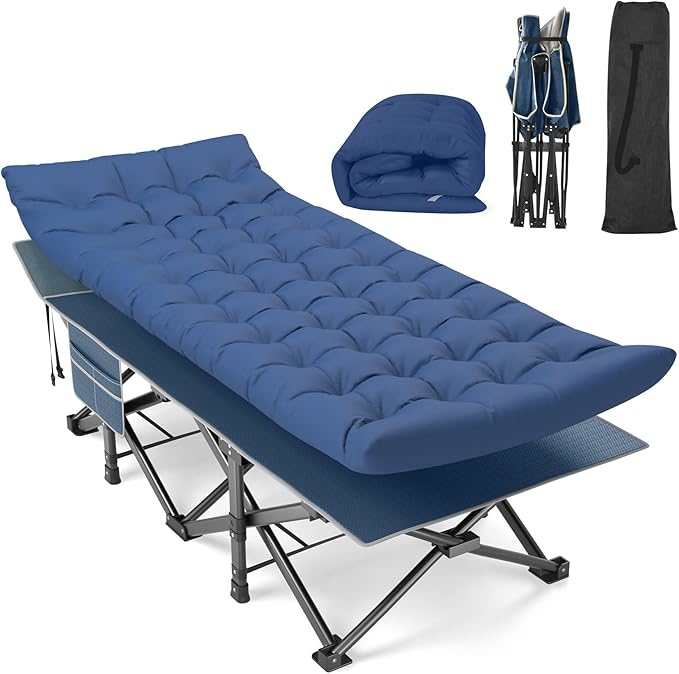 - 【Built-in Pillow Design】The headboard of our cot is a slanted design with built-in pillows, no need for extra pillows. The slight incline is ergonomically designed to ensure no more back, neck or shoulder pain in sleep! The mattress is also soft and thicker, so this is a very comfortable folding camping cot