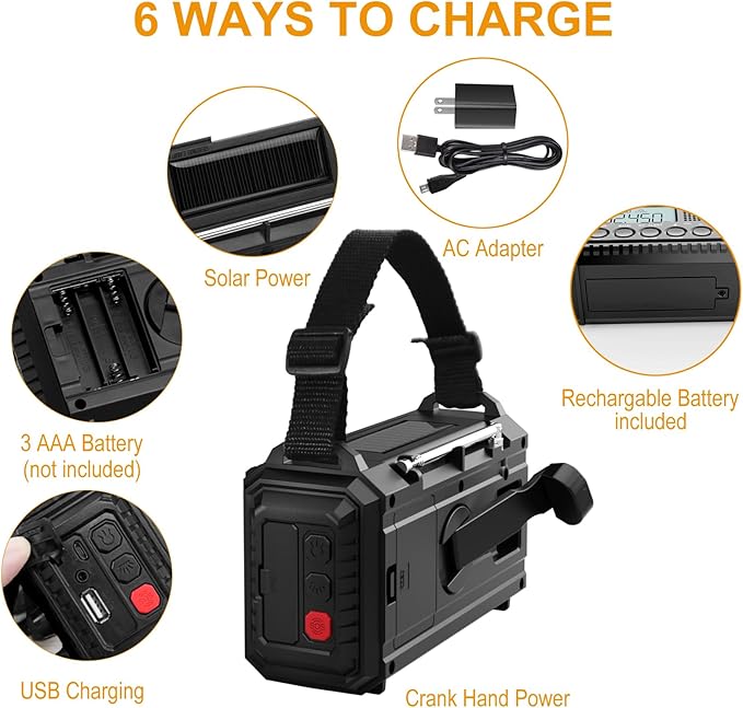 - 6-WAY CHARGING OPTIONS - An NOAA Weather radio with multiple charging backup options is the ideal choice. 6-way charging options including a built-in rechargable backup battery, an AC adapter, DC 5V USB input,hand-crank, solar panel, and 3 AAA batteries(not included in packing), which is more powerful and reliable, which can provide instant, automatic, around-the-clock messages regarding weather alerts.