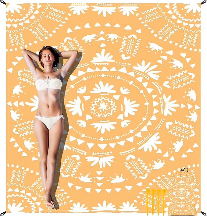 Sandproof Waterproof Beach Blanket, 78''×86'' Large Foldable Picnic Blankets for 1-4 Adults w/ 4 Stakes & 4 Pockets, Polyester Lightweight Sand Free Boho Outdoor Beach Mat for Camping, Hiking, Travel