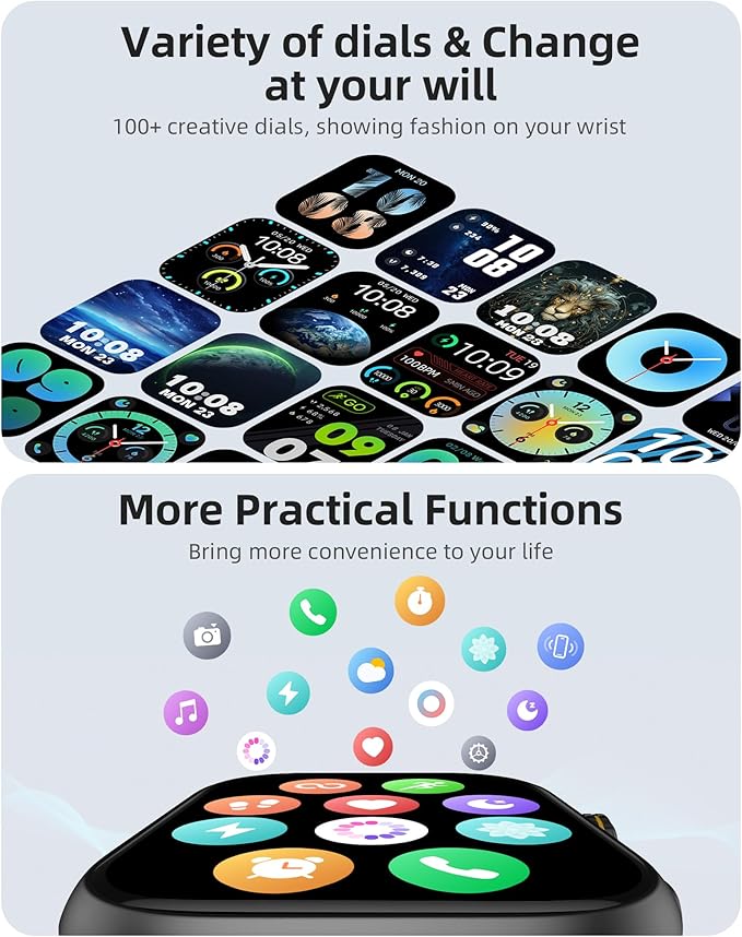 - Special Feature : Answer/Make Calls, iPhone & Android Compatible, Stopwatch, Sedentary Reminder, Lightweight, Workout, Workout Records, Step Calorie Activity Tracker, Multi-Sport Tracker, Message Alerts, Raise to Wake, Breathing Training Monitoring, Female Health Monitoring, 100+ Dial Selection, Brightness Adjustment, Goal Achievement Reminder, and more, Bluetooth 5.3 Calls and Text, SMS, APP Smart Notifications, Built-in GPS Fitness Tracker, 100+ Sports Modes, 30M/IP68 Waterproof/Dustproof, 24-Hour Heart Rate/SpO2/Sleep/Stress Monitor, Pedometer/Calories/Distance Record, Customize Dials, Step Counter, Alarm Clock, Music Control, Easy to Replace 22mm Strap, Find Your Phone, Contact Person Answer/Make Calls, iPhone & Android Compatible, Stopwatch, Sedentary Reminder, Lightweight, Workout, Workout Records, Step Calorie Activity Tracker, Multi-Sport Tracker, Message Alerts, Raise to Wake, Breathing Trainin… See more