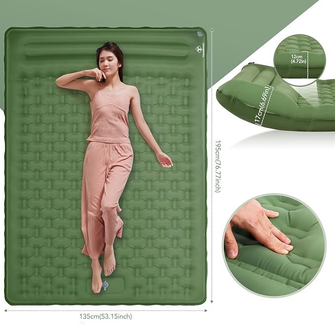 - 【Upgraded Support & 5" Thick Sleep Support】: ThOMSHOO self-inflating pad for camping is up to 77*53*5 inches, long enough for tall people. The 5" thickness with upgraded support is good for a side sleeper, and a built-in pillow is comfortable and convenient. Providing optimal comfort and support, ensuring a restful sleep during outdoor adventures for multiple days.