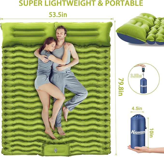 - Superior Comfort and Support: This self-inflating sleeping pad offers ample space and innovative air cells with built-in pillows, relieving pressure on your back and neck for maximum comfort and warmth during sleep. The dimensions of our camping mattress pad are: 79.8" x 53.5" x 4"