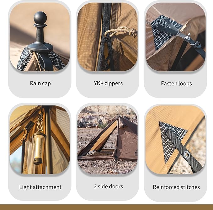 - 𝙃𝙞𝙜𝙝 𝙎𝙩𝙖𝙣𝙙𝙖𝙧𝙙: This lightweight tent is made of 70D Sil-Coated Nylon fabric, provides excellent dirt/ water/ abrasion resistance, with PU coated waterproof rating 3000mm performance and premium quality snag-free YKK zippers