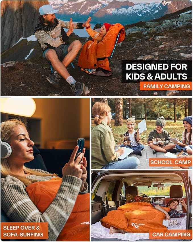 • CAMP IN COMFORT FOR ALL AGES - Bring home comforts to the great outdoors, ensures a restful night's sleep after a day of activities with your family. Designed for all ages, with vibrant colors that appeal to kids and adults alike, this sleeping bag for kids and adult is a great gift idea for your childern when class camping,sicence camp and summer camps approaching! Experience great warmth and comforts with this kids sleeping bag!