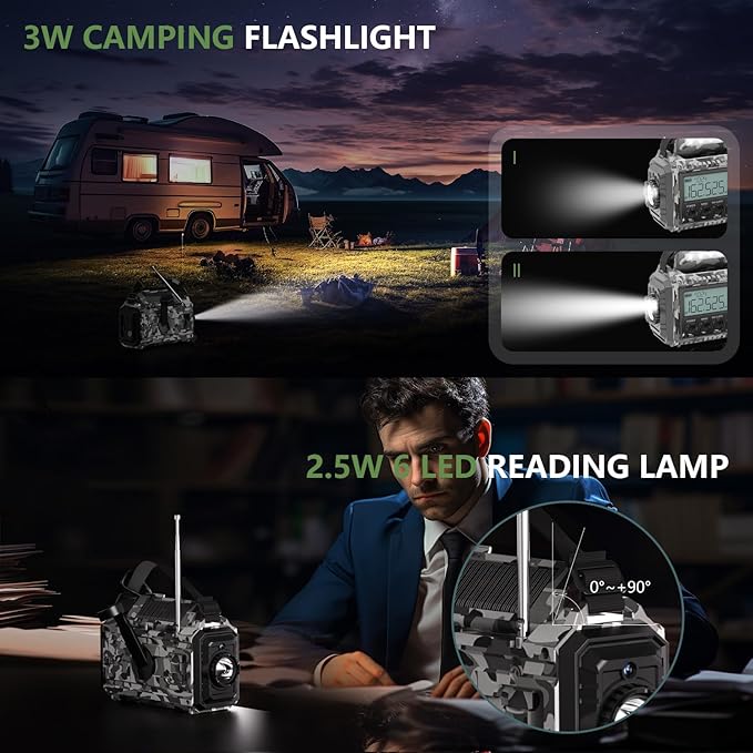 - Emergency Radio with Camping Flashlight & Reading Lamp - This portable survival radio provides instant emergency alerts. Press the red SOS button to activate a loud alarm and flashing SOS flashlight to aid rescue efforts. It also includes a 3W flashlight and a 2.5W reading lamp with adjustable brightness for various needs, perfect for use during power outages—a vital tool for enhancing safety in severe weather or emergency situations.
