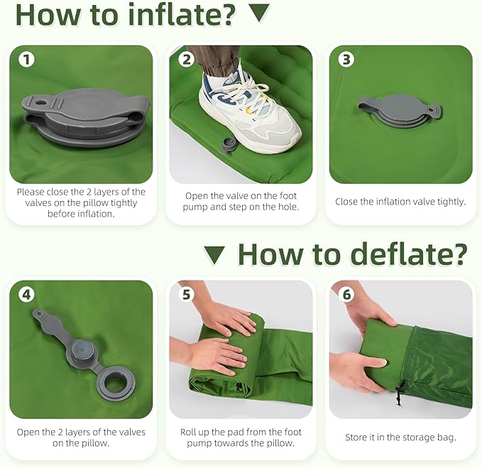 - 【Only 30s Step to Inflate & 1s Deflate】 Including an innovative built-in foot pump- Just pedal 30-60s to fully inflate the camping mat, which is convenient and easy, no longer need to inflate with your mouth, hands or carry a pump, and it only takes 1 second to quickly deflate. With the upgraded version of the air release valve with no leaking film, you shall never worry about air leaking!
