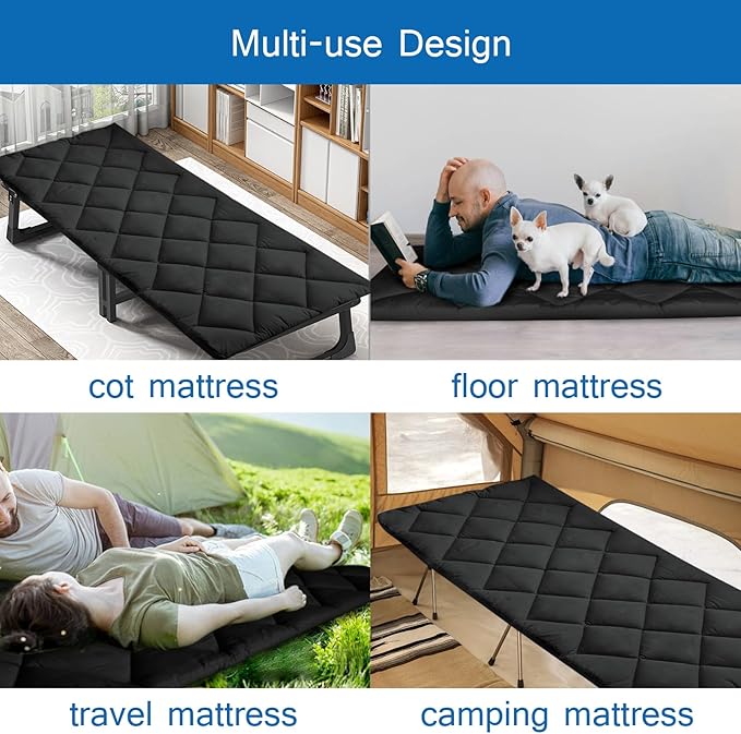 - Multiple-uses: The cot mattress topper can fit up to most camping cots, including flat cots, cots with elevated head, folding cots with pillow, lounge chaise chairs. The cot pads for camping also perfect for any outdoor activity like traveling or car camping for family, indoor use for house guest bed, floor mattress and kids play mat.