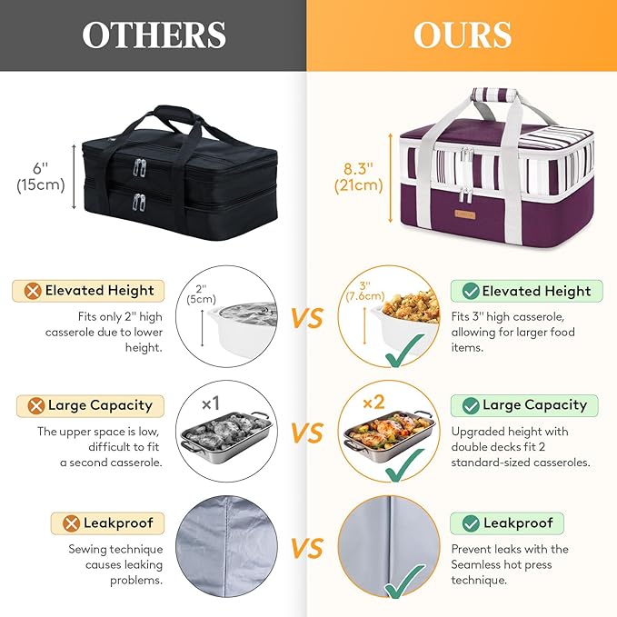 - Dual Compartments: The externally measured dimensions are 15.7" × 11.4" × 8.3" (L × W × H). It can fits 9" × 13" , up to 11" × 15" casserole and baking dishes (not included).