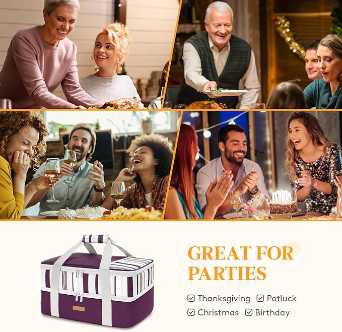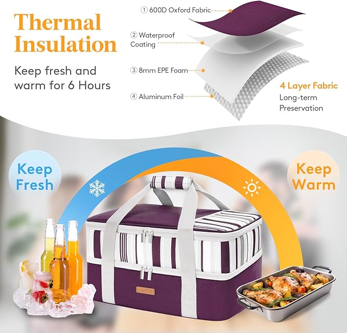 Double Decker Insulated Casserole Carrier for Hot or Cold Food, Lasagna Lugger Tote for Potluck Parties/Picnic/Cookouts, Fits 9"×13" Baking Dish, Purple