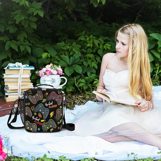 cfpolar Game Lunch Box for Boys Girls, Video Game Controller Insulated Lunch Bags for Kids Reusable Mini Cooler Lunch Tote Lunchbox Thermal Meal Tote Kit with Shoulder Strap for Work School Picnic