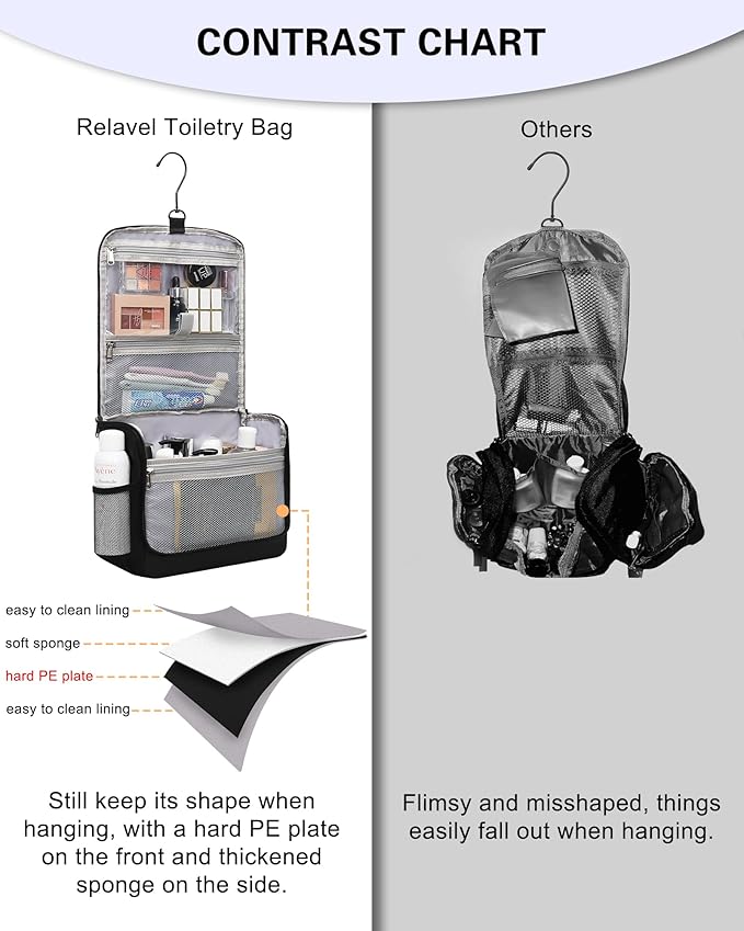 - Unique Design: Relavel toiletry bag has a unique design with a hard PE plate of the main compartment, keeps its shape when hanging, does not worry about dropping things, easy access to the items. More convenient and practical than the same type of toiletry bag on the market. Fully open design that gives you a comprehensive glimpse of your stuff.