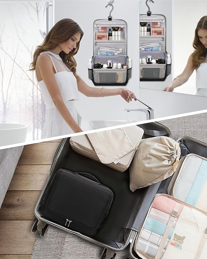 - 360° Rotatable Hanging Hook: The toiletry bag for men with a 360° swivel non-slip metal hanging hook for versatile hanging options. It is big enough to allow you to hang it up on the bathroom, door, closet rod, towel rack, coat hook, door knob, etc.