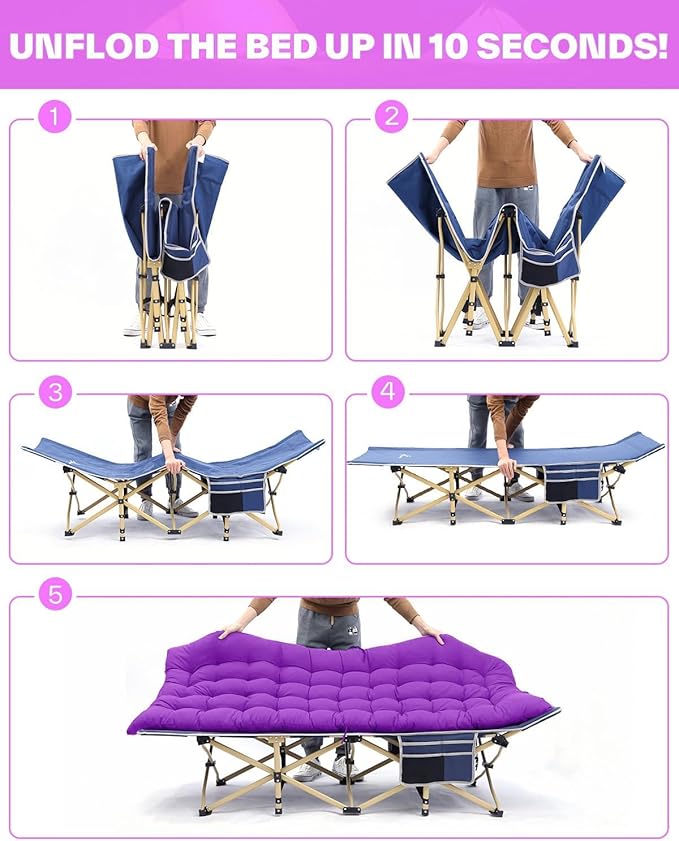 Sportneer Camping Cot, Camping Cots for Adults with Mattress Max Load 450 LBS Heavy Duty Portable Sleeping Folding Bed with Padded for Camping Tent Office Outdoor Travel Sleep Over (1, Blue+Purple)