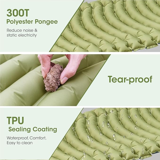 - Durable TPU Coated & High-quality 300T Polyester Pongee, Perfect for any Weather Conditions: The sleeping pad is made from high-quality 300T polyester Pongee material, reducing noise & static electricity. With extra-thick and durable TPU coating, offering tear resistance, waterproof, thermal insulation, resists moisture, and is easy to clean. Suitable for various terrains such as rocks, beaches, grasslands, etc.