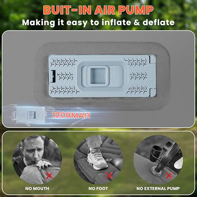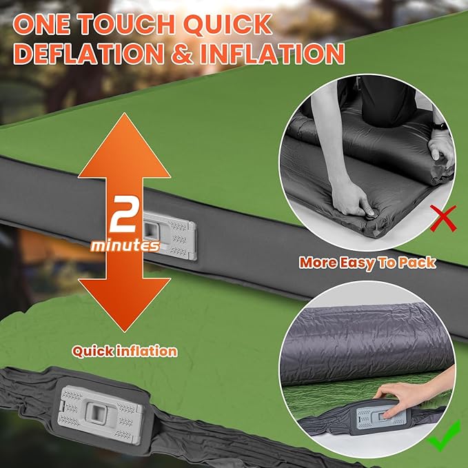 - BUILT-IN ELECTRIC PUMP, 1MIN AUTOMATIC DEFLATION: The sleeping pad has a built-in electric pump to realize one-touch inflation and deflation in 1 minute, just slide the button and you'll have a super comfortable camping mattress pad. The camping pad can be compressed to only 0.8" thick, which greatly saves storage space, say goodbye to the hassle of inflating and storing by mouth, hands or feet, creating a relaxing and unparalleled camping trip.